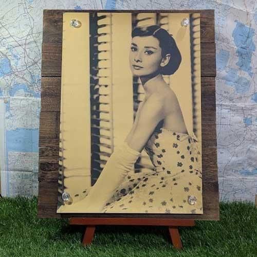 花柄のドレスを着て窓際でたたずむオードリーがデザインされています。